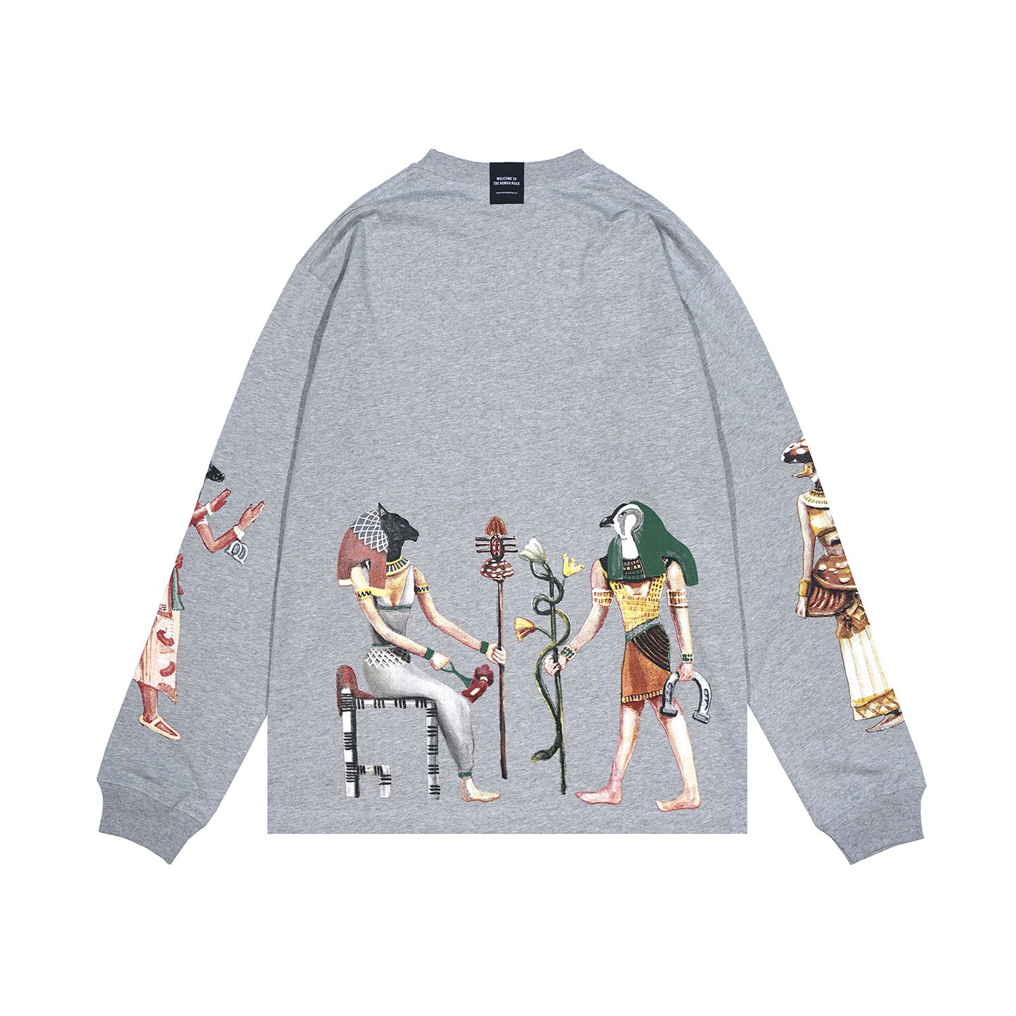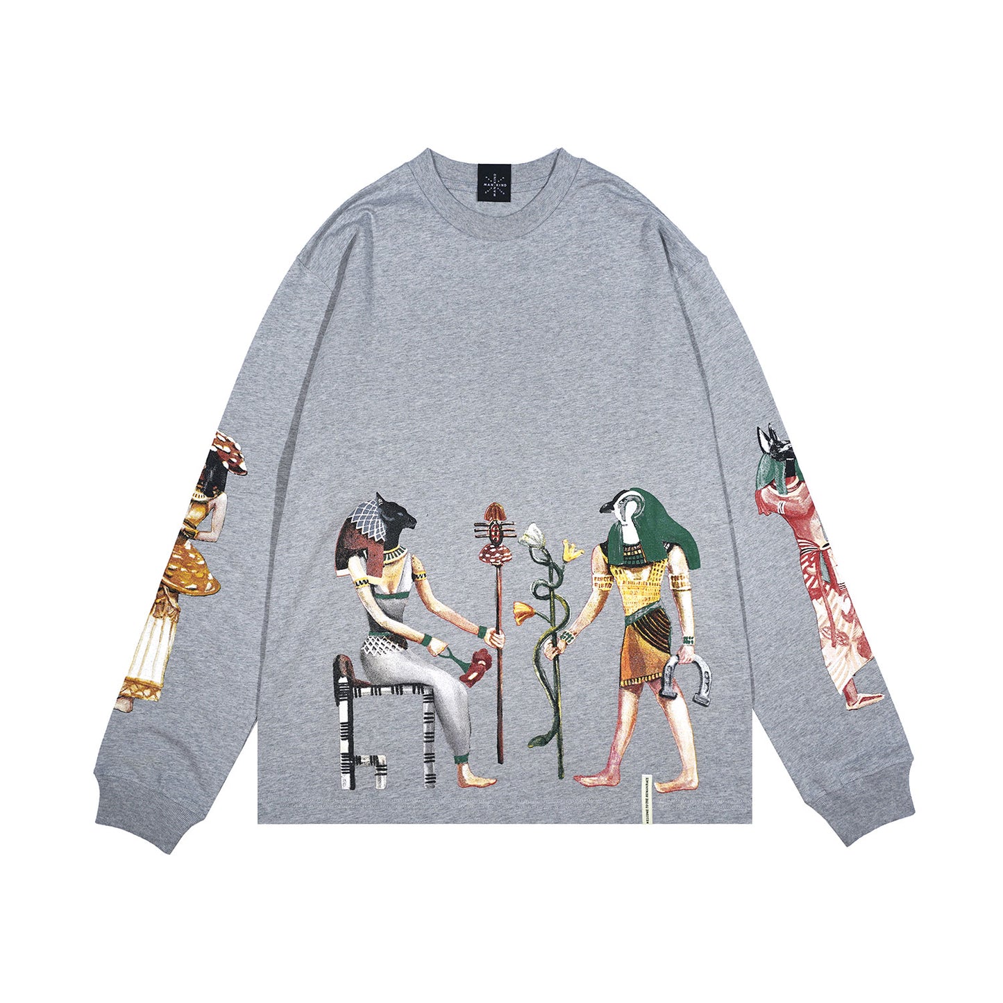 In a sleek misty colour, this long-sleeve tee is both stylish and versatile. Crafted from high-quality cotton with a weight of 180 gsm, it ensures comfort and durability. The standout feature is the captivating screenprinted graphic, inspired by the rich history of ancient Egypt, blending modern design with timeless inspiration.